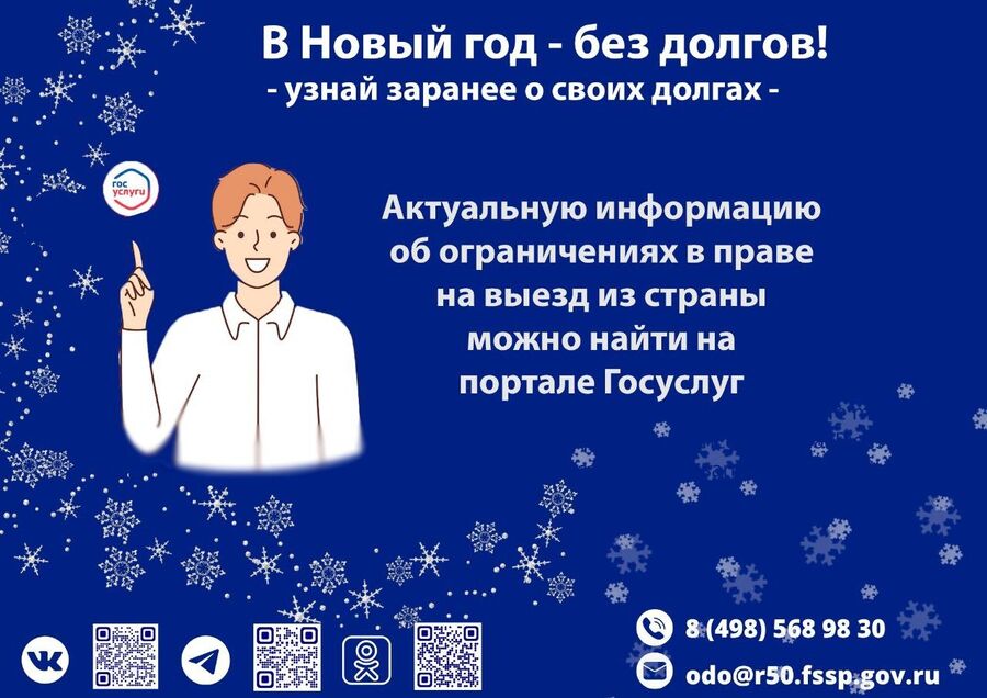 В преддверии новогодних праздников и запланированных заграничных поездок рекомендуем жителям Подмосковья уточнять информацию о наличии либо отсутствии возбужденных в отношении них исполнительных производств, в рамках которых могут быть наложены ограничения.