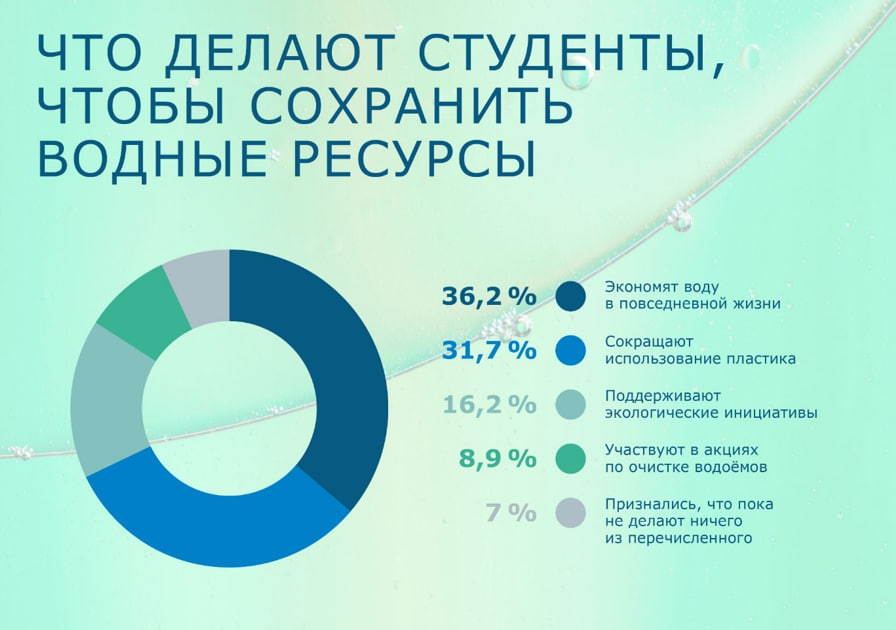 Несмотря на высокий уровень обеспокоенности, многие респонденты уже предпринимают конкретные шаги: 36,2% экономят воду в повседневной жизни, 31,7% сокращают использование пластика, 16,2% поддерживают экологические инициативы, а 8,9% участвуют в акциях по очистке водоёмов. Только 7% признались, что пока не делают ничего из перечисленного.