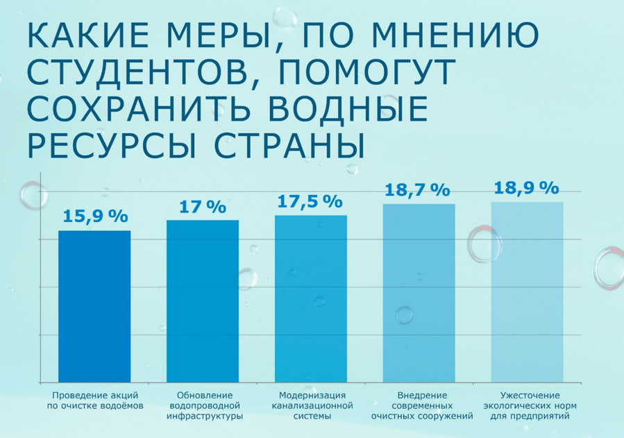 Среди мер, которые, по мнению студентов, могут улучшить ситуацию, чаще всего называются ужесточение экологических норм для предприятий (18,9%), модернизация и запуск очистных сооружений (18,7%). Также респонденты выделяют необходимость обновления канализационной системы (17,5%), водопроводной инфраструктуры (17%) и проведения акций по очистке водоёмов (15,9%).