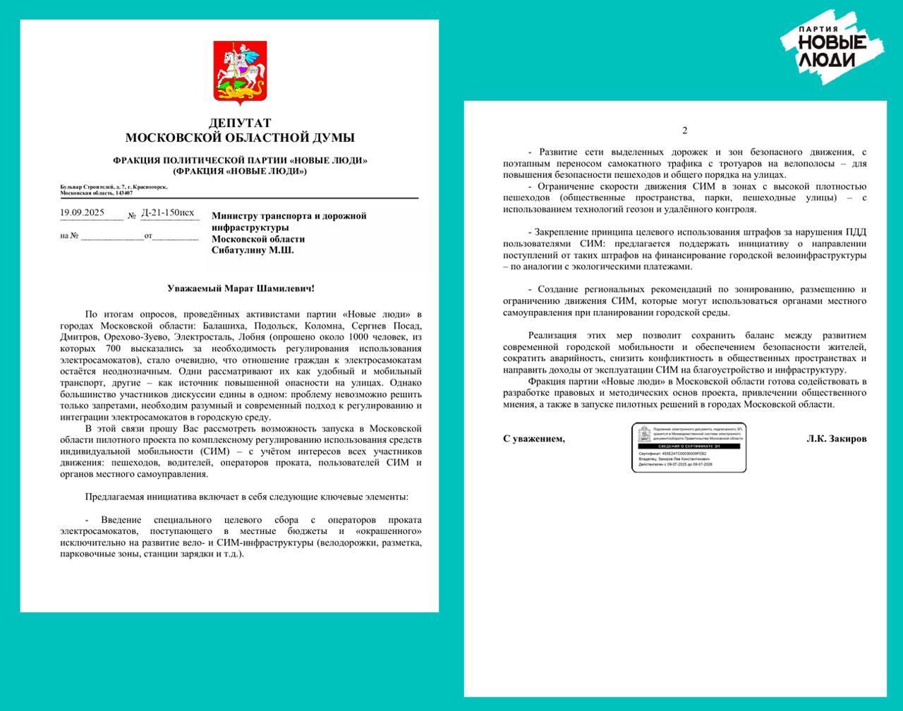 Фракция партии «Новые люди» в Московской областной Думе под руководством Льва Закирова выступила с инициативой по запуску пилотного проекта по комплексному регулированию использования средств индивидуальной мобильности (СИМ), в первую очередь электросамокатов.
