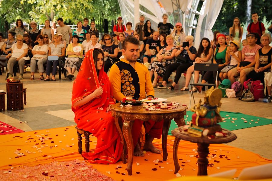 «Сари невесты и кушак жениха соединяют между собой, символизируя, что молодые люди теперь соединены. Брахман читает молитвы, поет мантры, берет клятву с жениха и невесты. В конце венчального обряда он связывает руки молодых гирляндой из цветов. Это символизирует, что отныне и души двух людей связаны навеки. Жених с невестой должны обойти свадебный огонь семь раз», — раскрывают детали свадебной церемонии организаторы фестиваля «День Индии».