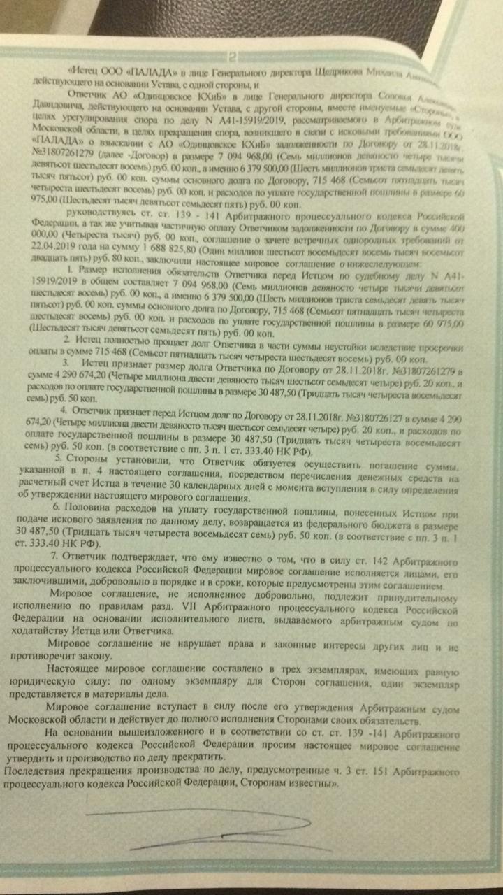 «Ответчик (АО «Одинцовское КХИБ» — прим. ред.) признает перед Истцом (ООО «ПАЛАДА – прим. ред.) долг по договору от 28.11.2018 №3180726127 в сумме 4 290 624,20 (Четыре миллиона двести девяноста тысяч шестьсот семьдесят четыре) руб. 20 коп. И расходов по оплате государственной пошлины в размере 30 487 рублей», — говорится в определении мирового соглашения.