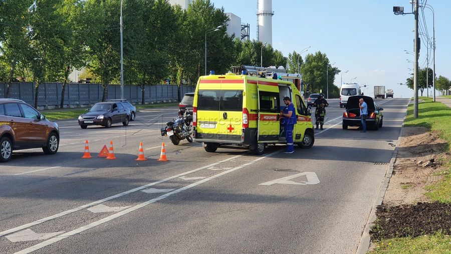 Сегодняшнее столкновение легкового автомобиля с мотоциклом на улице Подольских Курсантов не привело к неприятным последствиям для управлявших транспортными средствами и пассажиров.