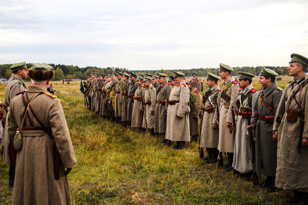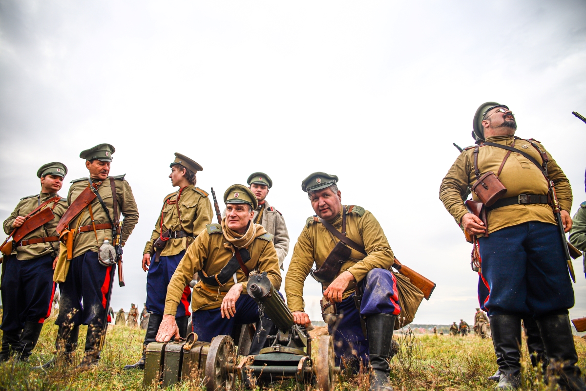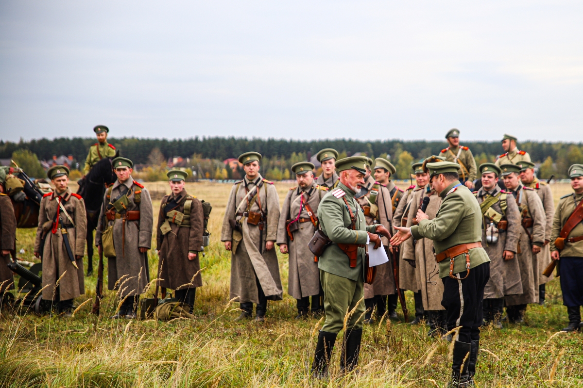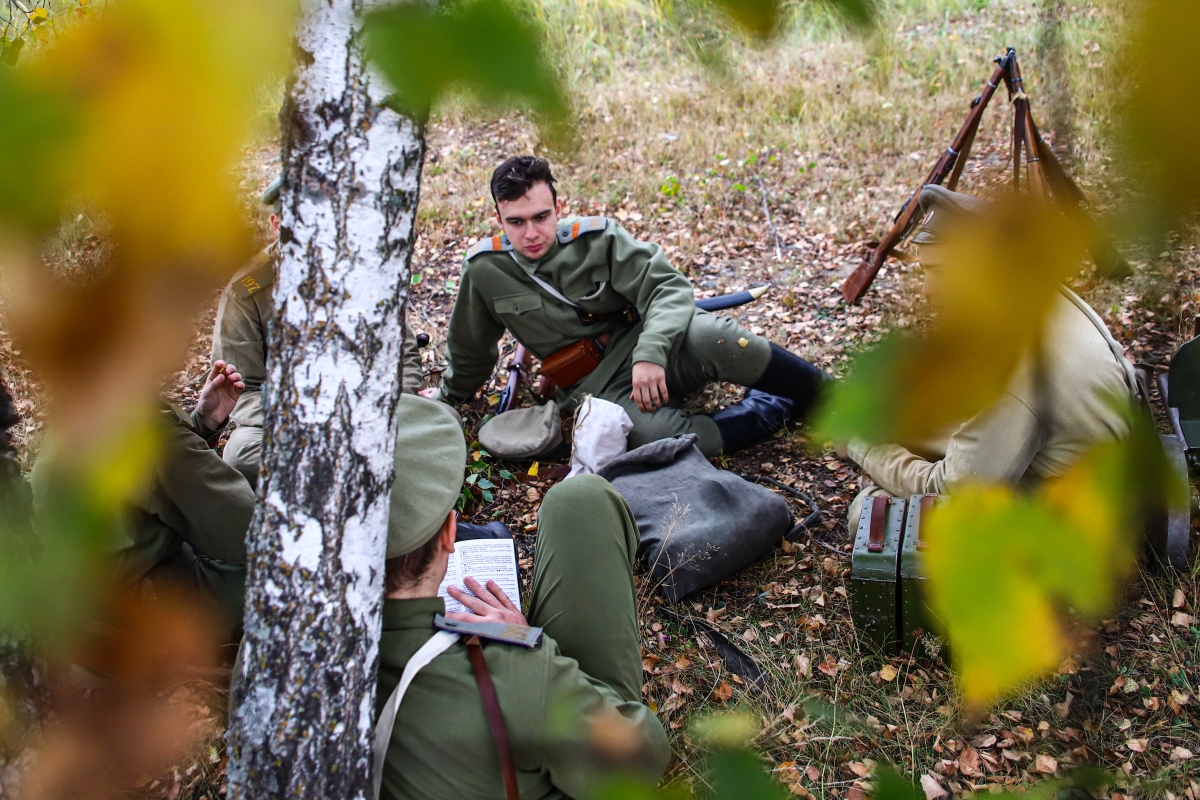 Музейная площадка представляет собой чистое поле, по краям которого едва заметны намеки на 21-й век: ближе к горизонту в багряной осенней листве маячат крыши дачных домов, иногда из-за крон выскальзывает и снова теряется современный автомобиль. А перед полем перекличка эпох еще интереснее: вот мальчишка с игрушечным монстриком во все глаза глядит на чинов Российской императорской армии, расположившихся под березой с чаем; а вот одетые по форме начала прошлого века реконструкторы делают снимки на Canon с таким внушительным объективом, что любой фотожурналист позавидует.