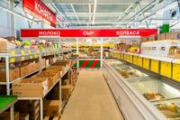 Магазин работает по принципу продсклада: товары расположены в торговом зале на паллетах и стеллажах в заводских упаковках, что позволяет использовать всю площадь торговой точки
