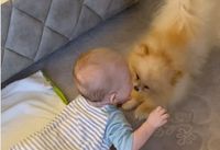 Яна разрешает младенцу играть с собакой